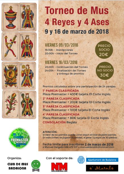El Club de Mus de Badalona os anima a participar en este trepidante campeonato de mus en su estado más puro. La cita serán los próximos viernes 9 y 16 de marzo, así que guardar sitio en vuestras agendas y animaros a disfrutar de un día de órdago rodeado del mejor ambiente y buena compañía.