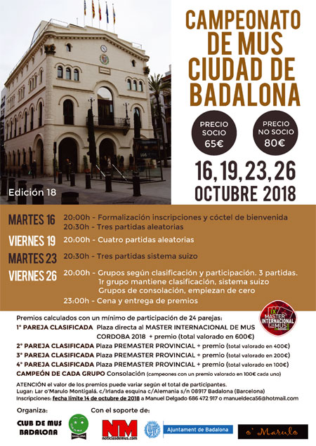 En este mes de octubre tendrá lugar nuestro tradicional campeonato Ciutat de Badalona 2018. Aquellos que aún no hayan conseguido plaza directa para el Master Internacional de Mus que se celebrará este año en Córdoba tienen aquí su última oportunidad. Reservar en vuestras agendas los días y horarios siguientes: